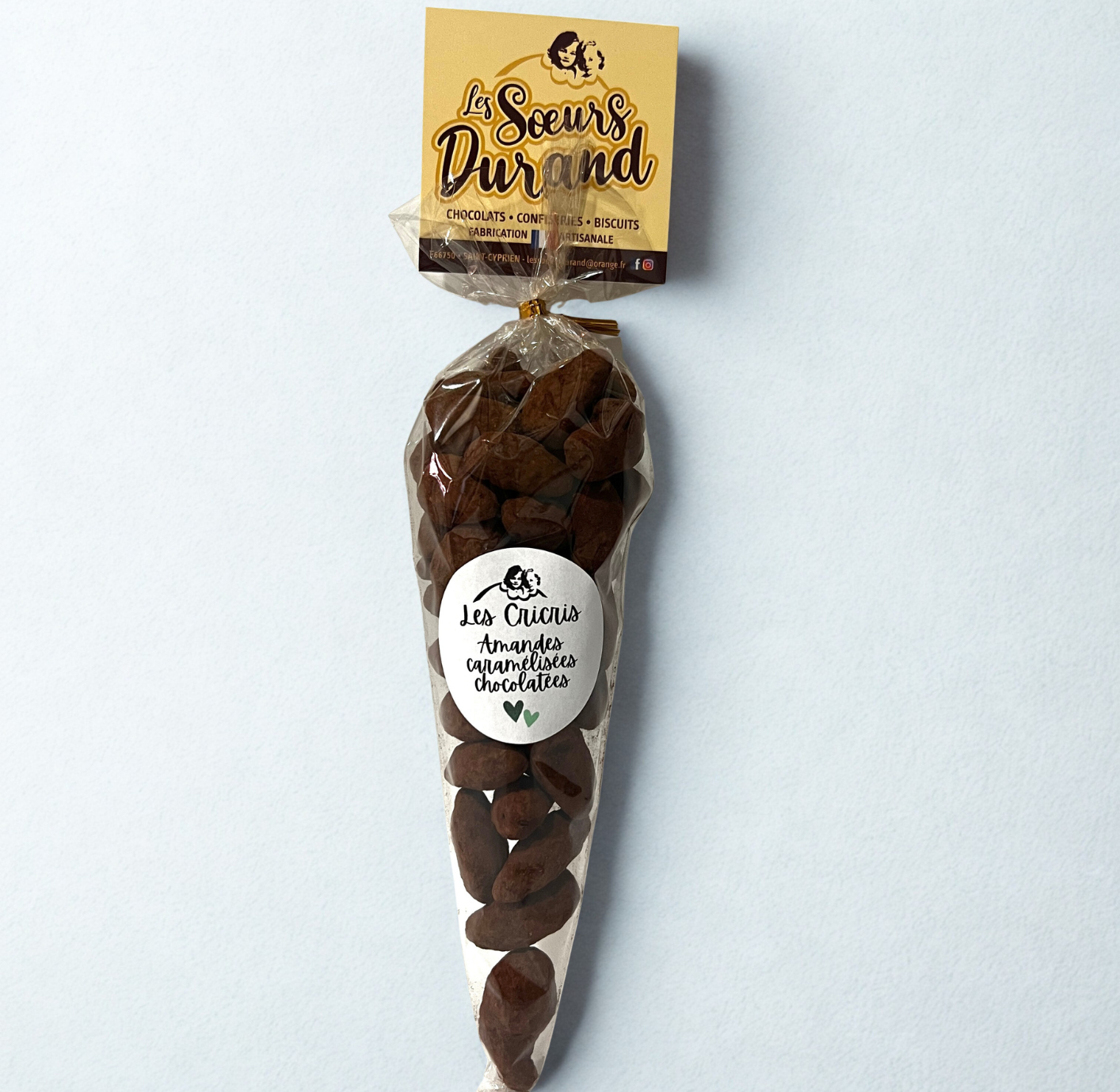 Amandes caramélisées enrobage chocolat lait 42%, poudre de cacao – Poids : 100gr / Origine : Pyrénées orientales