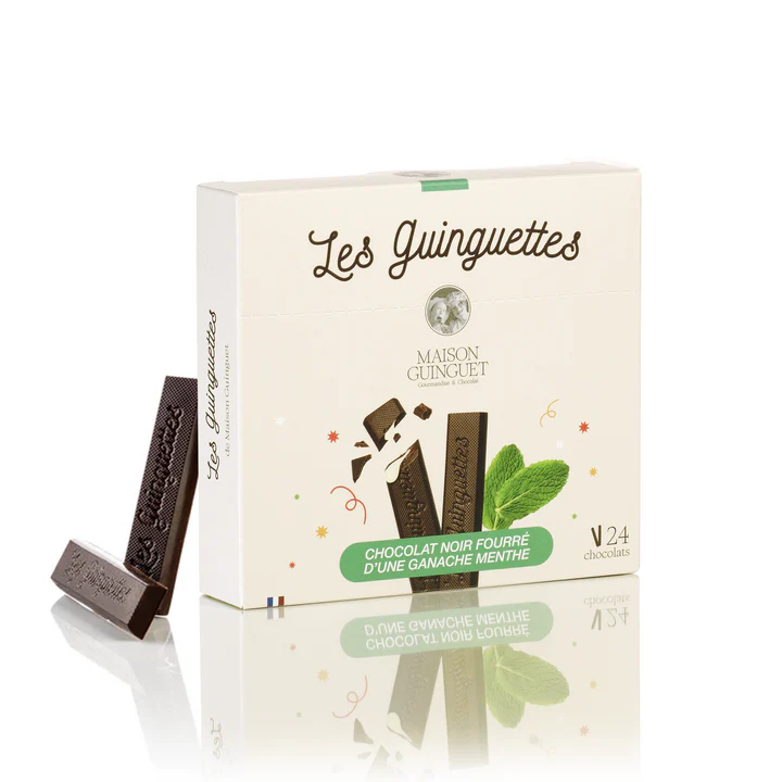 Les Guinguettes chocolat noir fourrés d’une ganache menthe – Poids : 180gr / Origine : Lot-et-Garonne