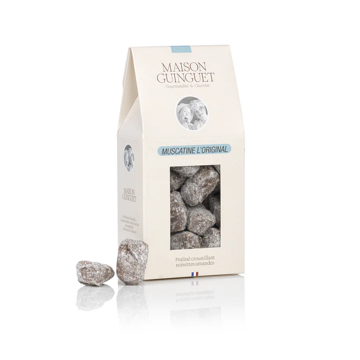 « Muscatine » praliné croustillant amandes et noisettes avec brisures de crêpe dentelle et chocolat au lait – Poids : Sachet 100gr / Origine : Lot-et-Garonne